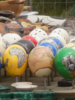 ".......... Langs de haven is de zondagse toeristenmarkt aan de gang. Houten maskers uit verre buurlanden en beschilderde struisvogeleieren uit Zuid-Afrika zelf ............."