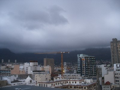 "........... Sinds ik terug ben verschuilt de Tafelberg zich onder het laaghangende wolkendek. ............"