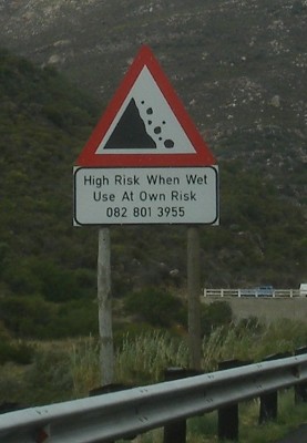 "........... Volgens het waarschuwingsbord voor vallend gesteente, een weg die vandaag niet geheel zonder risiko is: “High Risk When Wet. Use At Own Risk”. ............."