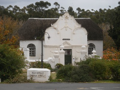 "........... Links beneden, aan het begin van de Kerkstraat, de mooie in Kaap-Hollandse stijl gebouwde kerk, ............."