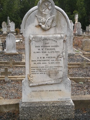 "........... Op het kerkhof ontdek ik een grafsteen “Ter Gedachtenis aan onze dierbare ouders W.W. Theron en A.H.M Theron”. Zouden dat de ouders of grootouders zijn van Danie Theron, een oorlogsheld uit de Tweede Boerenoorlog? ............."
