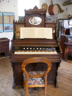 "........... Aan het plafond van de zaal, die verder vol staat met huisorgels in vele maten en soorten, ............."