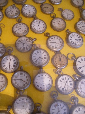 "........... Een horlogemakerij met een collage van zakhorloges - een teken van economische voorspoed? ............."