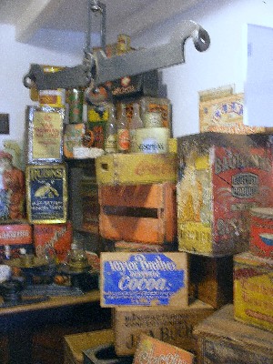 "........... het interieur van een dorpswinkel die vol staat met van die grote voorraadblikken uit grootmoeders tijd ............."