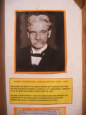 "........... In een hoekje hangt een portret van Dr. Albert Schweitzer. Die zou zo onder de indruk van het Moravische model zijn geweest, dat hij zijn dochter wilde laten opgroeien in een Moravische omgeving. ............."