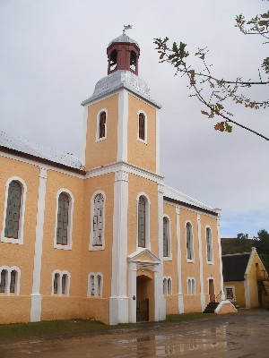 "........... en de biuitenkant van het toch wel wat vreemde gebouw kerk in vergelijking met de mooie Kaap-Hollandse kerken in andere zendingsdorpen ............."