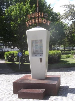 "........... Op de weg terug loop ik langs de zwijgend in het niets staande PUBLIC JUKEBOX, waarvan de C het niet meer doet. Een kapotte L had ik eigenlijk stukken intrigerender gevonden, dan was het een PUBIC JUKEBOX geweest..... ............."
