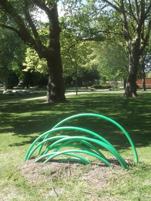"........... Van de bunker weglopend zie ik bij een schakelkast een half ingegraven bundel groene glasfiberkabel liggen. De twijfel slaat even toe. Is dit een werk van Kintera en deel van de tentoonstelling? Nee dus, de kabelaanleggers waren het vergeten op te ruimen...... ............."
