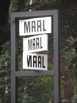 "........... en een bij het Maal-complex passende installatie die bestaat uit een drietal in een metalen frame gevangen houten borden met het opschrift MAAL, MAAL, MAAL, die in de wind om een as draaien. Malen dus. ............."