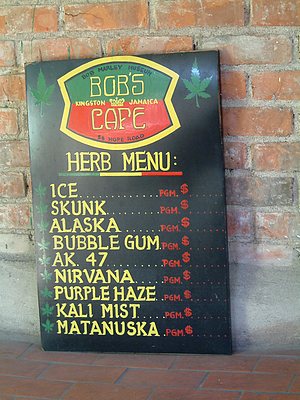 "........... Wat ik me echter goed herinner is het terras van het Bob's Café, met daarop het “HERB MENU” van de variëteiten marihuana die er zouden worden verkocht. ............."