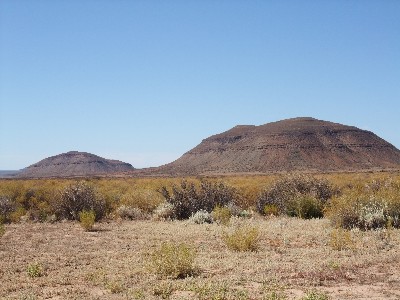 "........... Een stoffig zandpad door een vrijwel onbewoond droog landschap met lage fynbos begroeing en af en toe een bergje. ............."