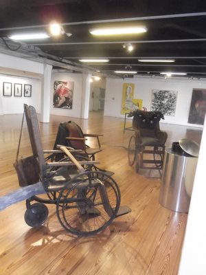 "........... Een installatie met onder andere een drietal antieke rolstoelen, die ik uit het atelier van de kunstenaar ken, trekken onmiddellijk mijn aandacht. ............."