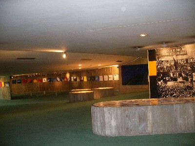 ".......... Gedempt licht, zachtgroene vloerbedekking. Mooi, rustig. Mysterieus, zo’n beetje als vroeger het communisme. De wanden en de vloeren golven zoals de buitenkant van het gebouw, niets is kaarsrecht. .............."