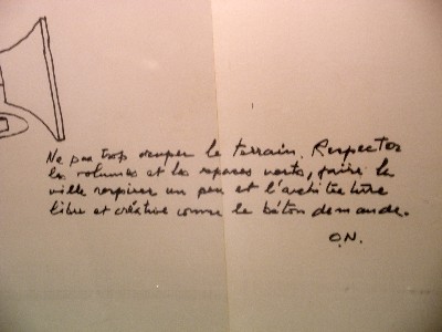 ".......... Vooral de handgeschreven aantekeningen boeien me. “Het terrein niet te overdadig bebouwen. Respectvol omgaan met de omvang en het groen, de stad een beetje laten ademen, de vrije en creatieve architectuur z’n gang laten gaan, zoals het beton verlangt. O.N.” .............."
