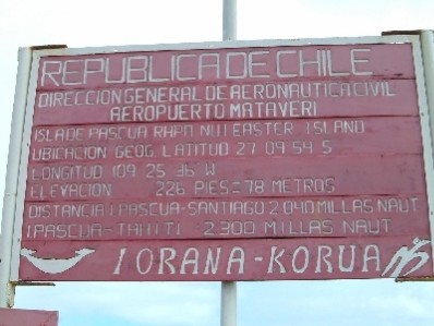 "..........Een wat knullig bord geeft aan dat ISLA DE PASCUA - RAPA NUI - EASTER ISLAND op 27 09 54 graden zuiderbreedte en 109 25 36 graden westerlengte ligt. 78 voet boven de zeespiegel. 2.040 zeemijlen van Santiago en op 2.300 van Tahiti. Een uithoek dus, die op Paaszondag 1522 werd “ontdekt” door de Zeeuw Jacob Roggeveen. ............."