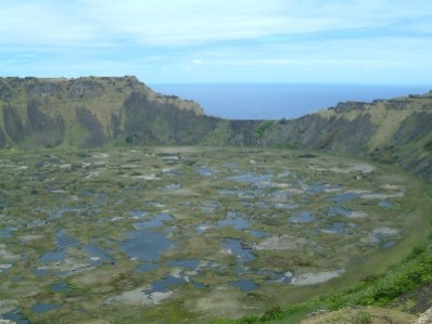 "..........Onderweg naar Orongo, stoppen we bij de krater van de vulkaan Rano Kau, die een diameter van 1.600 meter heeft en 200 meter diep is. De krater staat vol met water waarop eilandjes van plantaardig materiaal drijven. Er staat een koude wind, het is onaangenaam guur voorjaarsweer.