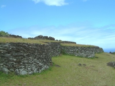 "........Er staan resten van huizen, zo te zien van leisteen, van de soort die ik ooit in Wales heb gezien, alleen de vorm is anders. In Orongo hebben de huisjes de vorm van een bootje. Het dorp werd in het verleden uitsluitend vroeg in het voorjaar bewoond voor “tangatu-manu - de vogelman” ceremonie, de verkiezing van de leider van Rapa Nui voor het komende jaar........."