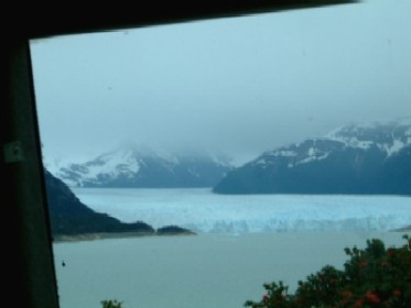 ".........Na een half uur is het zover, in de linker bovenhoek verschijnt een strook ijs die geleidelijk groter wordt, er drijven brokken ijs in het meer. We komen in de buurt van ons reisdoel: de gletsjer Perito Moreno.............."