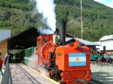"................ Tot mijn spijt is dit niet de spoorlijn die Paul Theroux zo mooi beschrijft in zijn boek “De oude Patagonië-Expres” maar een fleurig rood geschilderde locomotief die een rijtje al even fleurig groen geschilderde wagons trekt. Met andere woorden het is een echt toeristentreintje dat op de smalle 60cm brede rails van de voormalige gevangenisspoorlijn rijdt..................."