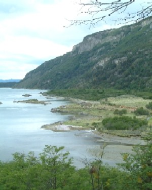 "..............Vervolgens door een bos naar een wat hoger gelegen punt waar we goed Lapataia kunnen zien liggen waar volgens de gids het einde van de wereld zou zijn. Vanuit de verte lijkt het daar allerminst op, het enige dat ik zie is een steiger op een landtongetje in een baai.