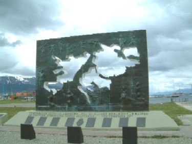 ".............Het monument bestaat uit een enorme betonnen muur - een klaagmuur? - waarin de contouren van de eilanden zijn uitgespaard. Als je er voor staat, kijk je waarschijnlijk in de richting waar de eilanden liggen. Vlakbij staat een kleine cenotaaf voor de 323 zeelieden die tijdens dezelfde oorlog op volle zee verdronken, ................."