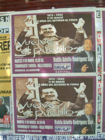 verziezingsposter van Adolfo Rodríguez Saá met een triomfantelijke Juan Perón