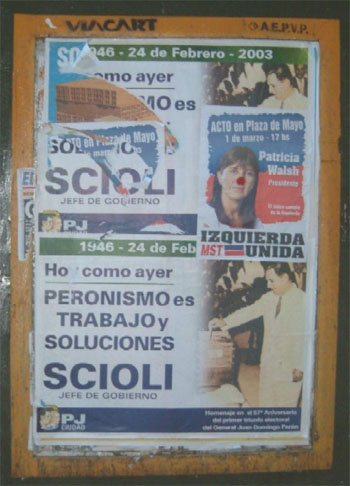 verkiezingsposter van Daniel Scioli meteen foto van Juan Perón die zijn stem uitbrengt