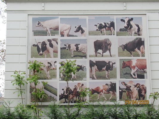 "........ Op een gevel in de Kortenaerstraat hangt een compilatie van 16 foto´s met koeien in de wei erop, ............."