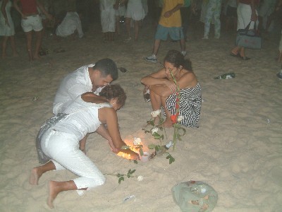 ".......Ze graven kuiltjes op het strand waarin kaarsjes worden gebrand en waar bloemen, drank en/of vruchten omheen worden gezet. Dat alles dient om geluk voor het nieuwe jaar af te dwingen. Ook al ben je katholiek, baat het niet, schaden doet het evenmin. ...... "