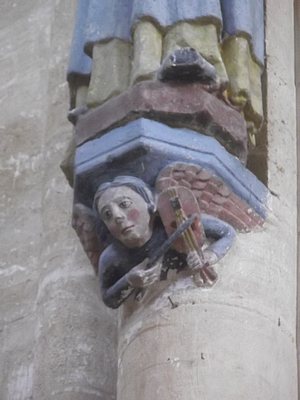 "........... de voet waarop ze steunen die bestaat uit een zijn instrument bespelende muzikant, een dier, een duiveltje. ............."
