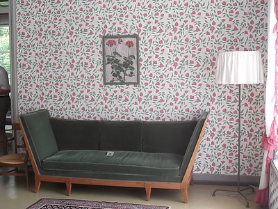 "........... Datzelfde zou overigens kunnen gelden voor het fleurige bloemetjesbehang in de salon, ............."