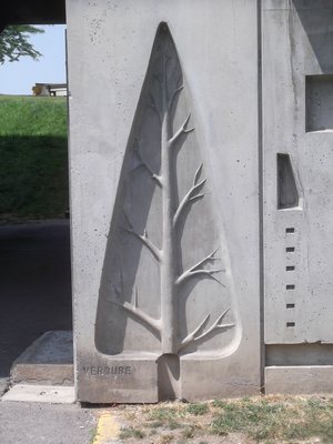 "........... Om het karakter van het gebouw te benadrukken zijn in de lijst een boom, een wolk en een zonnetje te zien: groen, ruimte en licht, de Cité Radieuse ten voeten uit. ............."