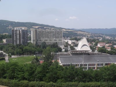 "........... zien we opeens de zeer herkenbare kerk in de diepte liggen. Op de voorgrond het culturele centrum en het stadion, op de achtergrond links betonnen hoogbouw – nog meer verticale groene stad dus – ............."