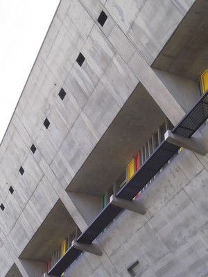 "........... De gevel aan de stadionkant is vanaf de grond gezien net een lang stuk schuin doorgezaagd beton ............."