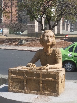 "........... Ik kijk, kijk nog eens en zelfs dan kan ik mijn ogen niet geloven, hoewel de tekst op de sokkel voor zichzelf spreekt: “Het is een groot wonder dat ik de hoop nooit heb opgegeven”, dagboek van Anne Frank, 15 juli 1944. ............."