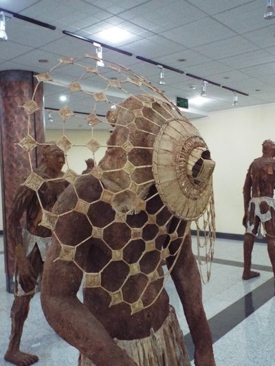 "........... grote van klei, houtsnippers, zand en gerecycled afvalmateriaal gemaakte mannen, die een traditioneel ambacht of een cultureel thema uitbeelden. ............."