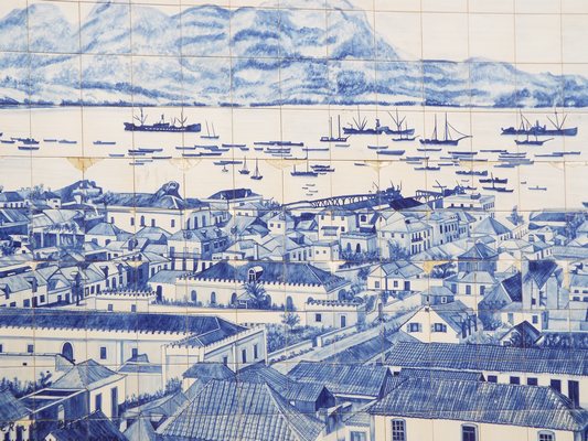 "........... met op de kop mooie blauw-witte tegeltableaus die tonen hoe de baai, de haven, ............."