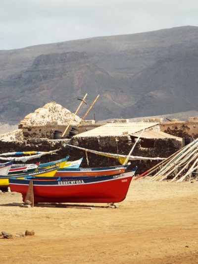 "........... Aan de kust wat vissersbootjes, maar geen vissers, ............."