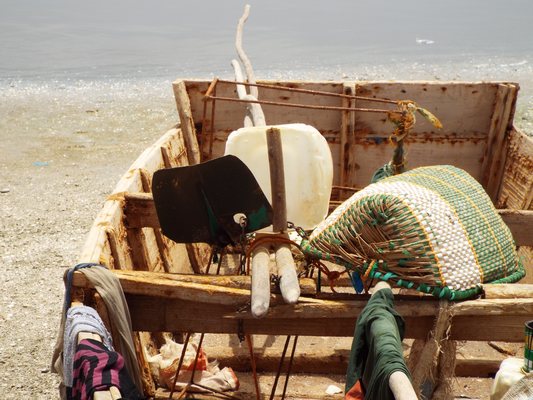 "........... Volgens Amadou duurt het uur of drie om het bootje te vullen met de aan een lange steel bevestigde spade. ............."