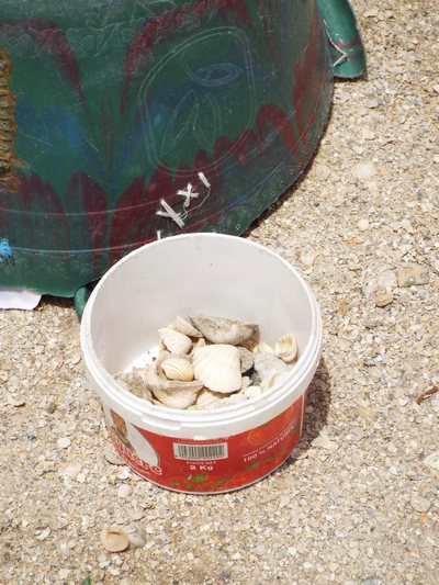 "........... Op de weg terug wordt een schelpje in een mandje gedaan, het aantal schelpjes aan het eind van de werkdag is gelijk aan het aantal manden zout dat is gelost en bepaalt de vergoeding die is verschuldigd. ............."