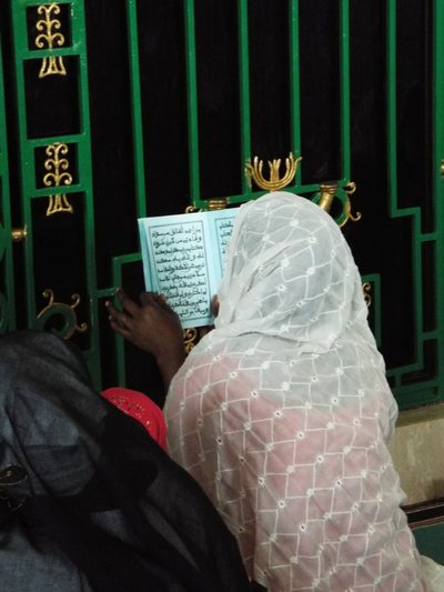 "........... Amadou Bamba ligt in de moskee begraven, alwaar zijn graf het reisdoel is van de pelgrims die tot de Broederschap behoren, ze zitten bij de schrijn van hun geestelijke leidsman uit de koran te lezen of te bidden. ............."