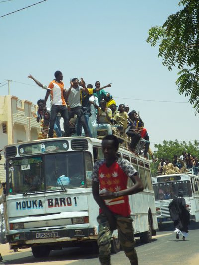 "........... Het zijn net Argentijnse voetbalsupporters onderweg naar het stadion, maar dit zijn pelgrims die naar Touba gaan. ............."