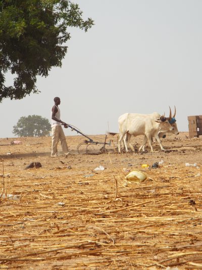 "........... langs een akker die wordt geploegd door een man die de primitieve ploeg achter een paar stieren heeft gespannen. ............."