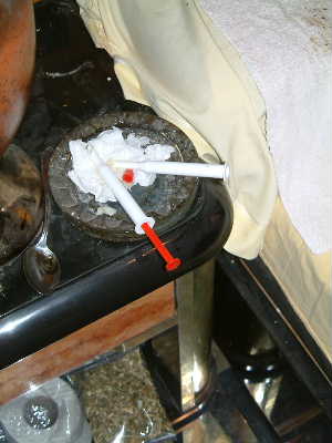 "............ De junkies uit kamer 21 hebben er een gigantische zooi van gemaakt. Gebruikte naalden en lepeltjes waar een vlam onder is gehouden op de nachtkastjes. De vloer is bezaaid met smerig ondergoed en gebruikt maandverband. Bah! . ............."