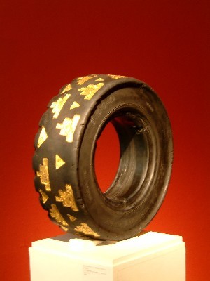 "..........Bij de ingang van de expositieruimte staat een glad afgesleten autoband op een piëdestal. Al veel te ver heen om van een nieuw profiel te voorzien.............."