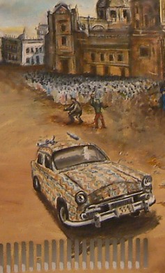"................. In het midden van het plein dus die opgewonden menigte. Plezier of woede?. Uit de straat links nadert een auto, type Amerikaanse klassieker. Pas na lang kijken zie ik dat de auto met flessen wordt bekogeld. Een kwaaie menigte derhalve, niks geen volksfeest. .............