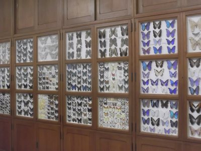 "........... in de ene hangt een aan het museum geschonken collectie vlinders – waaronder veel van die heel mooie blauwe morpho's – ............."