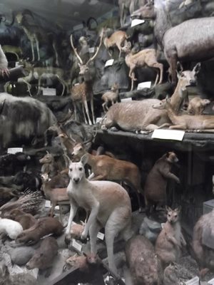 "........... in het achterste deel de opgezette beestenboel die men hier zelf graag de natuurhistorische collectie noemt. ............."