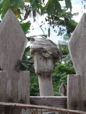 "........... steekt er boven het hekwerk een om iets heen geknoopte vaatdoek uit, als een hoofddoek om een hoofd. ............."