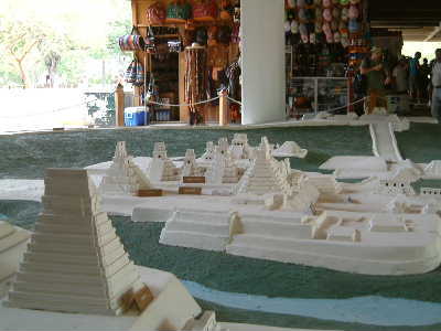 ".......... Om het bereiken van het uiteindelijke reisdoel – de tempels en de piramiden - zo lang mogelijk uit te stellen, stoppen we eindeloos bij het bezoekerscentrum, waarin een rare witte maquette zoiets als een voorproefje moet zijn van wat er allemaal gaat komen. ..............."